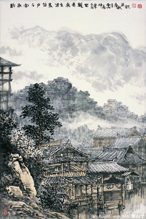 1、《苗寨楼高欲凌霄 》 赵春秋水墨写生
