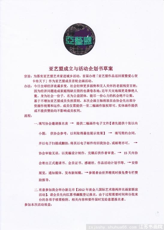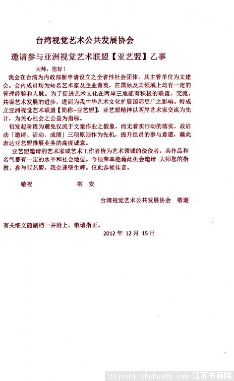 我江蘇書畫院受臺灣視覺藝術公共發展協會的邀請和委托.將在二0-二年元月左右率江蘇書畫院書畫藝術家赴臺訪問.訪問內容有書畫展.書畫交流(筆會),現場義賣和游覽寶島筆文化交流活動,為期8天左右.將不定期的分批赴臺,第-批名額有20至30名.往返和在臺食.住.行及展廳費和游覽等一切費用由我江蘇書畫院和臺灣視覺藝術公共發展協會共同協商承擔.藝術家無需出任何費用,具體情況可加我江蘇書畫院qq984263384了解.